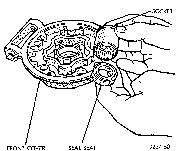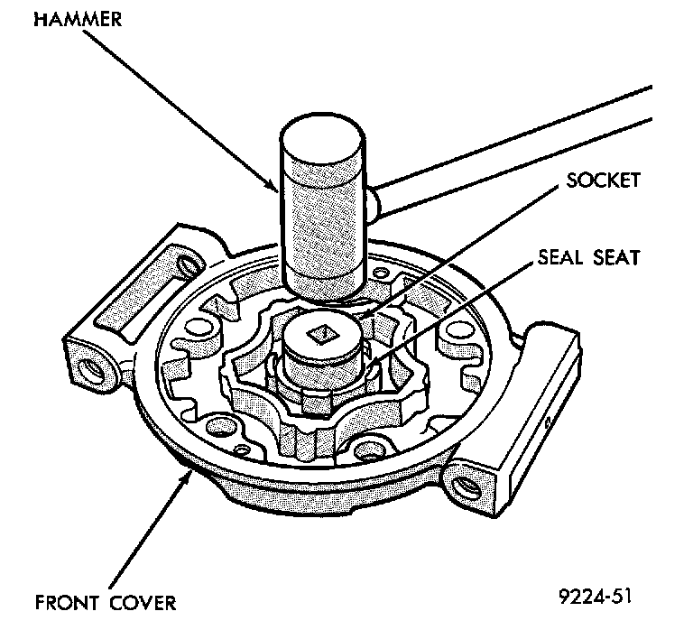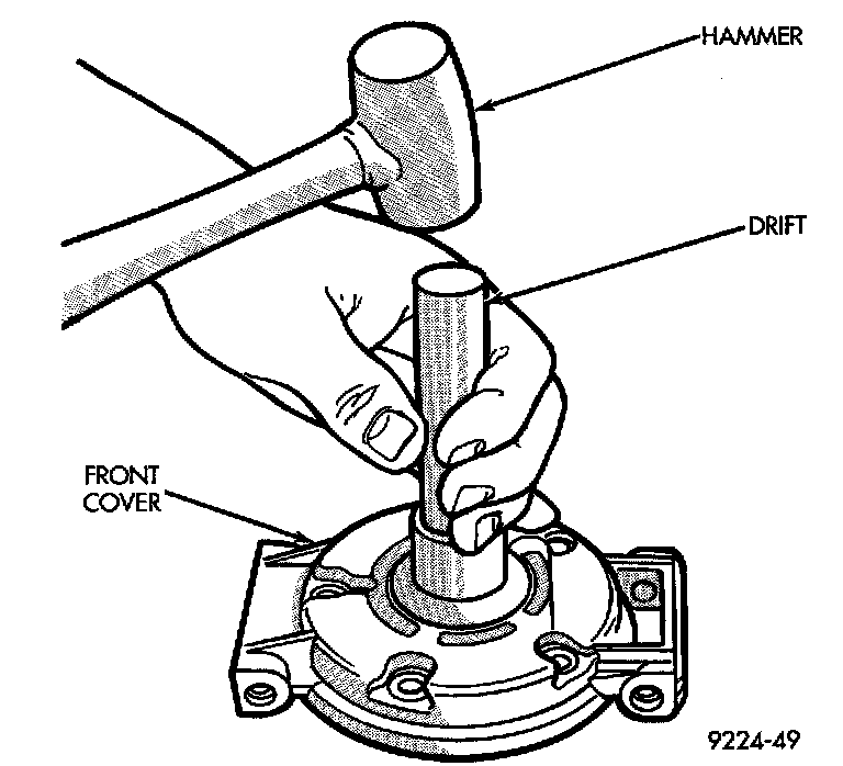9. Place compressor front cover on a flat surface with neck of cover facing up. Using a brass drift, press out seal assembly.