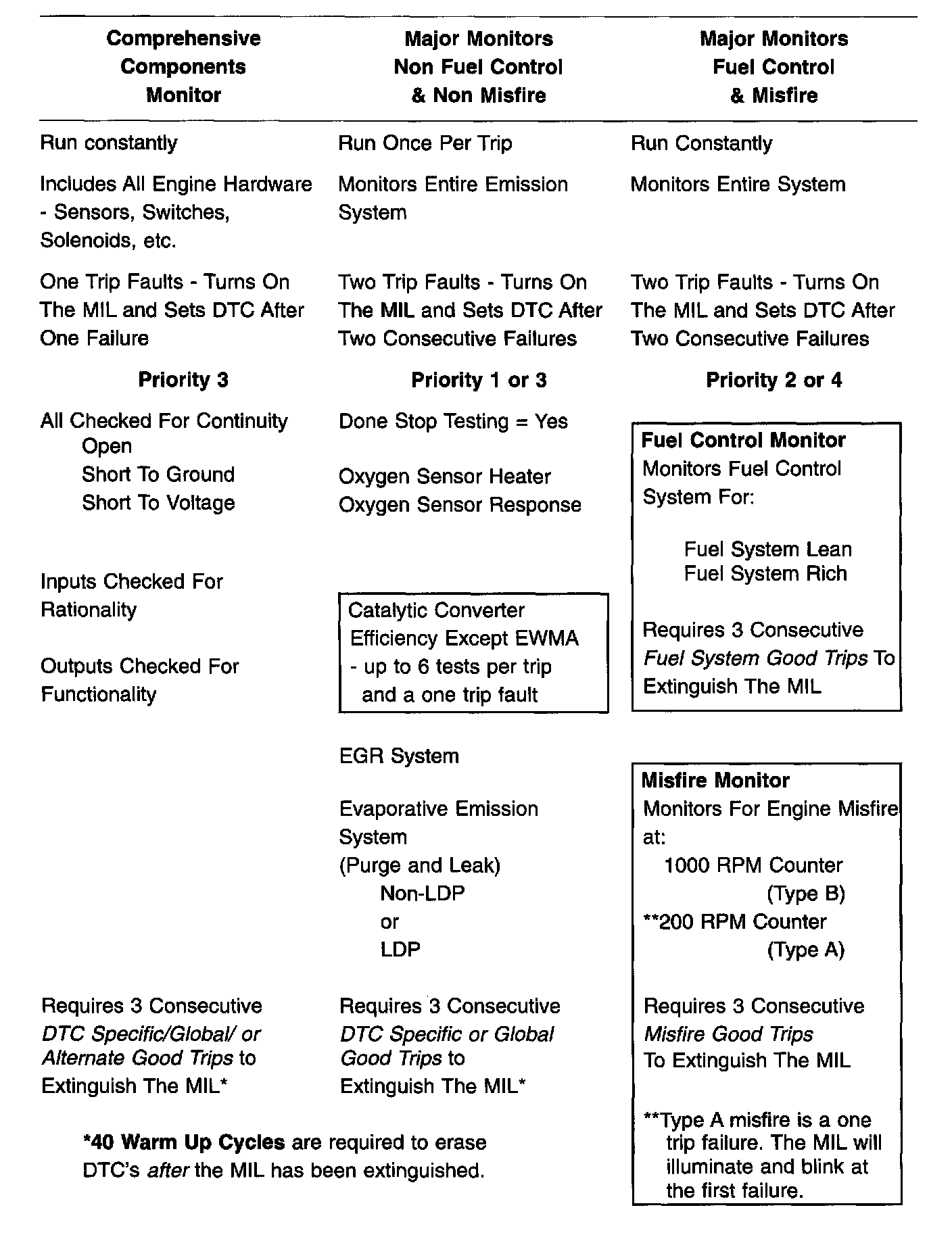The table summarizes the operation of the various OBDII monitors.