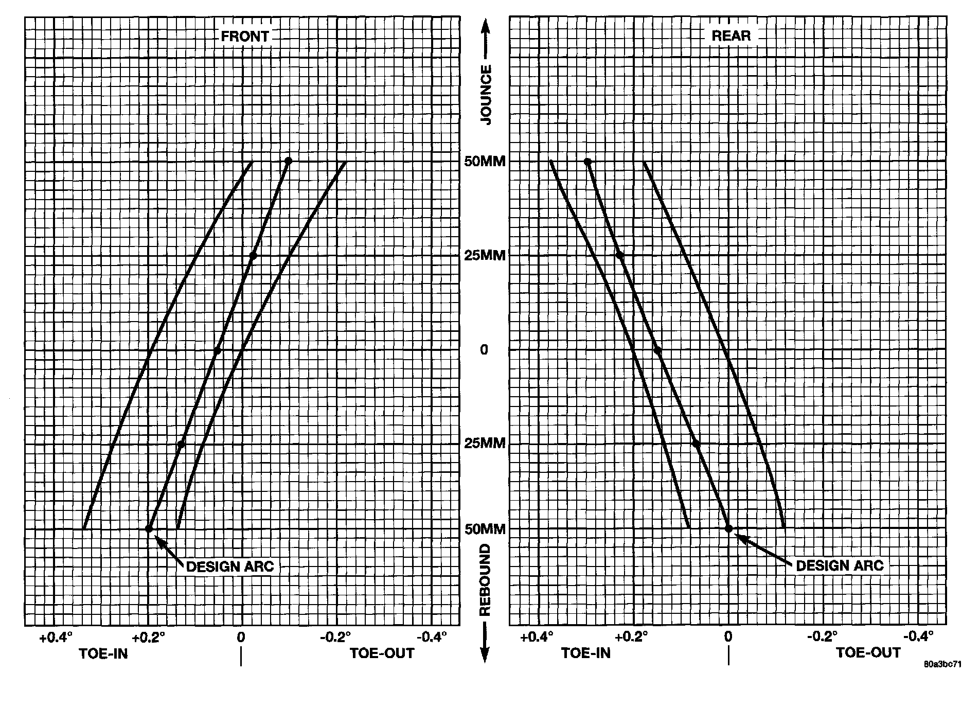 On the front of the vehicle, the tie rods are located in front of the spindles. If the steering gear is raised, toe-in will increase on rebound and toe-out will increase on jounce. If the steering gear is lowered the opposite would occur. The front toe pattern should arc from (-)0.10° toe-out at 50 mm (2 inch) jounce to (+)0.20° toe-in at 50 min (2 inch) rebound.