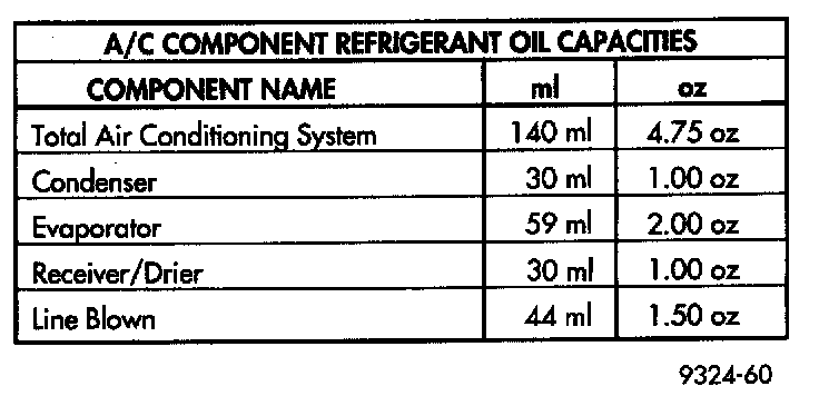 When an air conditioning system is first assembled, all components (except the compressor) are refrigerant oil free. After the system has been charged with R-134a refrigerant and operated, the oil in the compressor is dispersed through the lines and components. The evaporator, condenser, and filter- drier will retain a significant amount of oil, refer to the Refrigerant Oil Capacities Chart. When a component is replaced, the specified amount of refrigerant oil must be added. When the compressor is replaced, the amount of oil that is retained in the rest of the system must be drained from the replacement compressor. When a line or component has ruptured and oil has escaped, the compressor should be removed and drained. The filter-drier must be replaced along with the ruptured part. The oil capacity of the system, minus the amount of oil still in the remaining components, can be measured and poured into the suction port of the compressor.