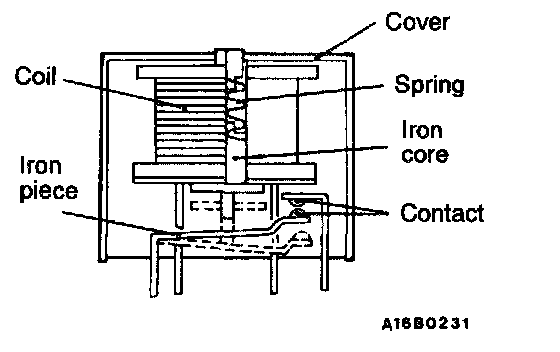 1. When current flows through the coil of a relay, its core is magnetized to attract the iron piece, closing (ON) the contact at the tip of the iron piece. When the coil current is turned OFF, the iron piece returns to its original position by a spring, opening the contact (OFF).