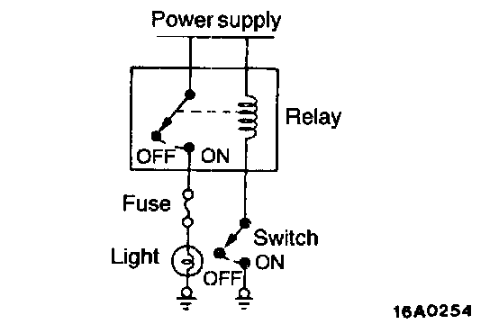 2. By using a relay, a heavy current can be turned ON and OFF by a switch using much less current. For example, in the circuit shown here, when the switch is turned ON (closed), current flows to the coil of the relay. Then, its contact is turned on (closed) and the light comes ON. The current flowing through the switch is much less than that for the light.