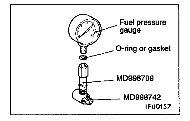 Use a suitable O-ring or gasket between the fuel pressure gauge and the special tool so as to seal in order to prevent fuel leakage at this time.