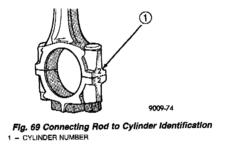 14. Remove connecting rod bearing caps. Connecting rod bearing caps are not interchangeable and should be marked before removal to insure correct assembly (Fig. 69).