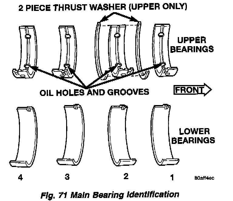 CAUTION: Main bearings are select fit. Refer to Engine, Service and Repair, Service Procedures, Fitting Main Bearings for proper bearing selection (Fig. 71).