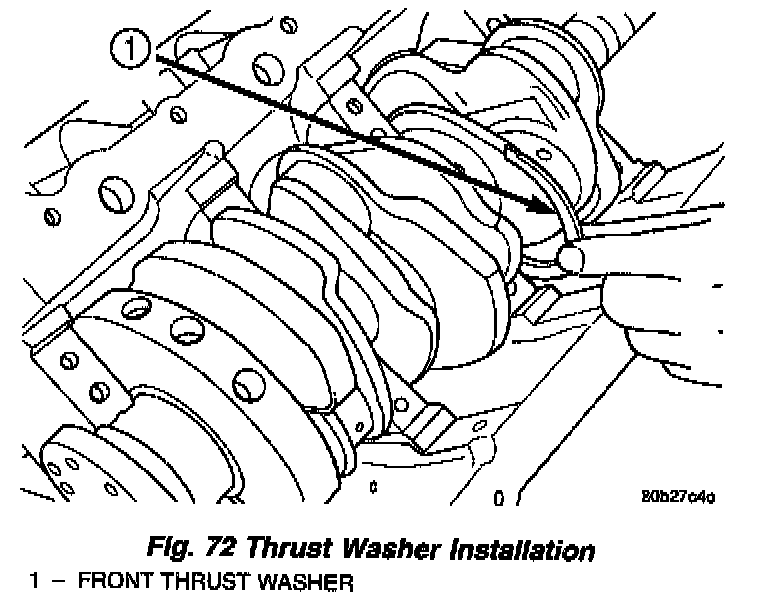 2. Move crankshaft forward to limit of travel. Lubricate and install the front thrust washer by rolling the washer onto the machined shelf between the No. 2 upper main bulk head and crankshaft thrust surface (Fig. 72).