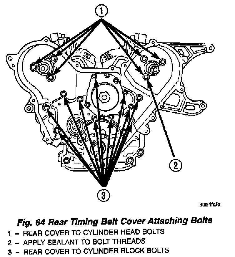 7. Remove rear timing belt cover to cylinder head fasteners (Fig. 64). Remove the rear covers.