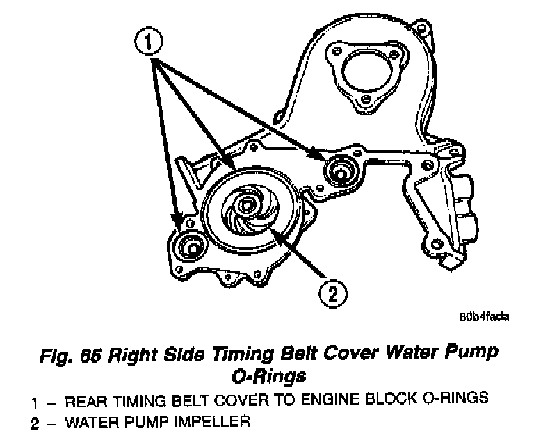 8. The right side rear timing belt cover has O-rings to seal the water pump passages to cylinder head (Fig. 65). Do not reuse O-rings.