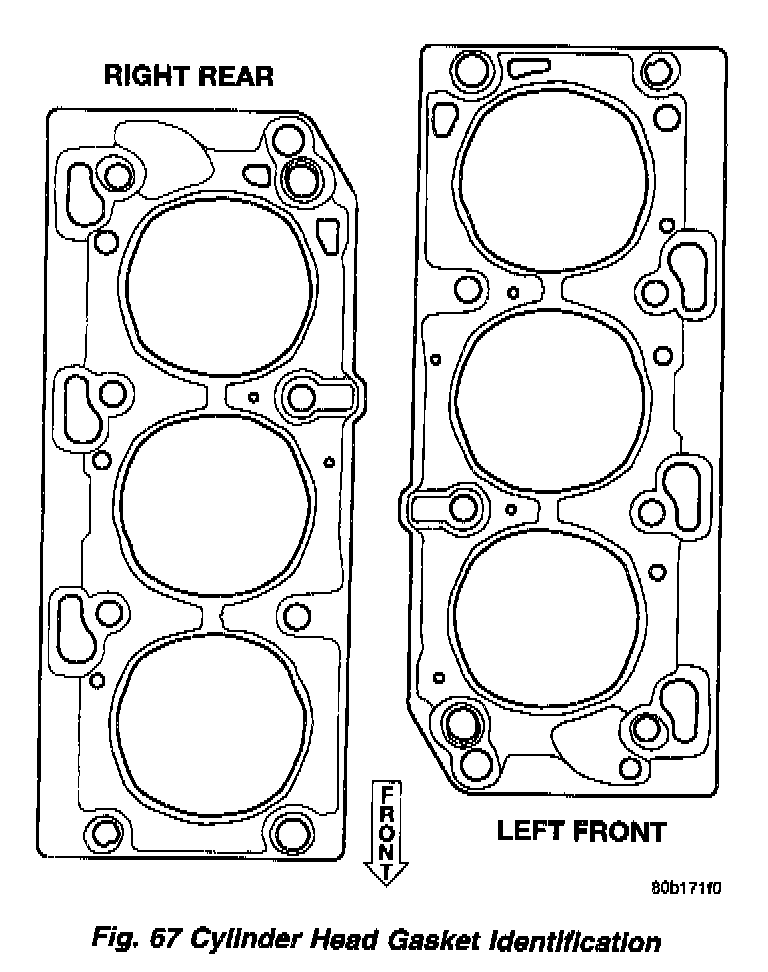 2. Install head gasket over locating dowels. Ensure the gasket is installed on the correct side of engine (Fig. 67).