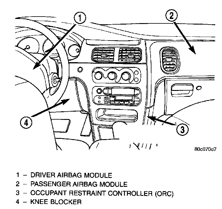 The accelerometer is located inside the ORC. The accelerometer provides confirmation of a crash, discriminating severity. The ORC monitors the system to determine the system readiness. The ORC may store sufficient energy to deploy the airbags for only two minutes after the battery is disconnected. The ORC contains on-board diagnostics, and will illuminate the AIRBAG warning lamp on the cluster when a fault occurs. The warning equipment is tested for a few seconds every time the vehicle is started.