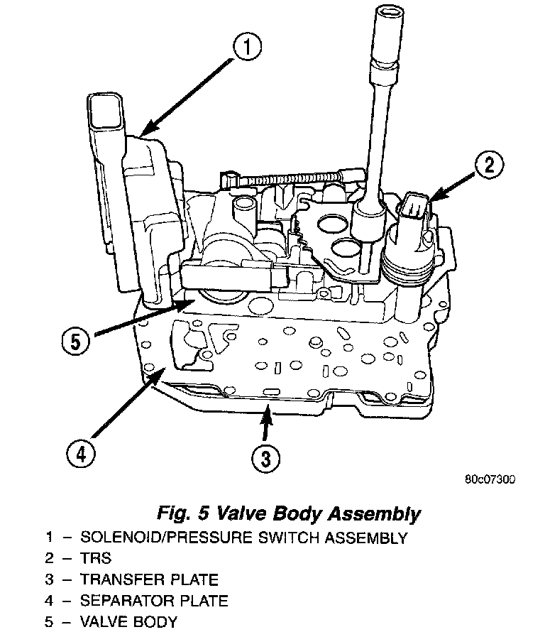 Also mounted to the valve body assembly are the solenoid/pressure switch assembly and the transmission range sensor (Fig. 5).