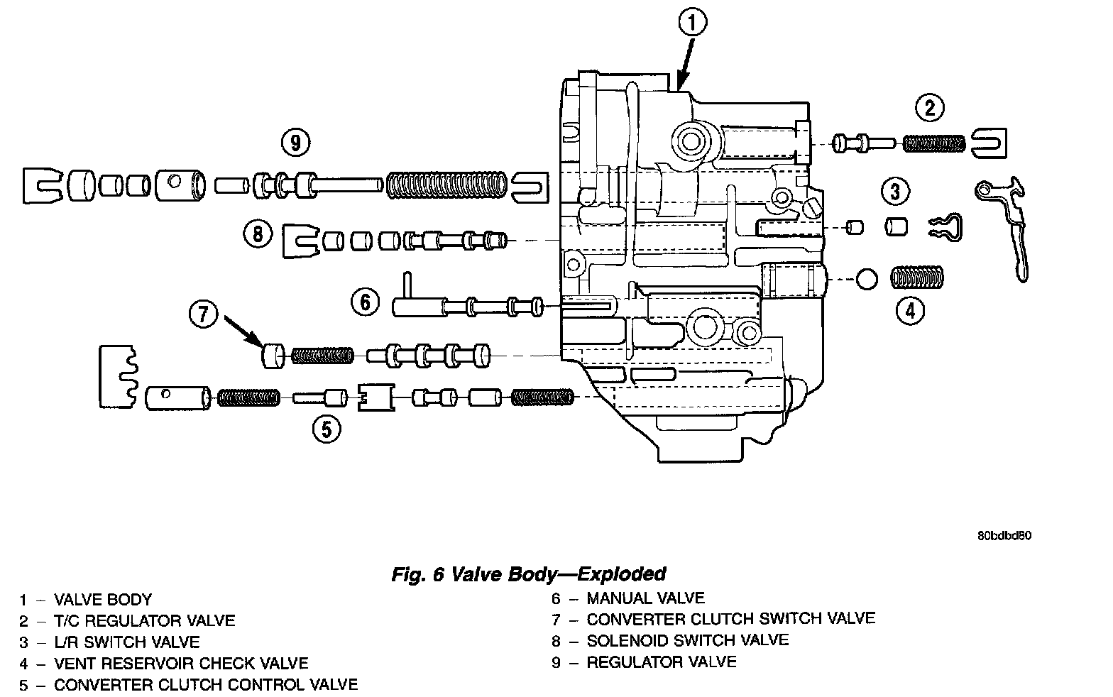 The valve body assembly (Fig. 5) consists of a cast aluminum valve body, a separator plate, and transfer plate. The valve body contains valves and check balls that control fluid delivery to the torque converter clutch, solenoid/pressure switch assembly, and frictional clutches.