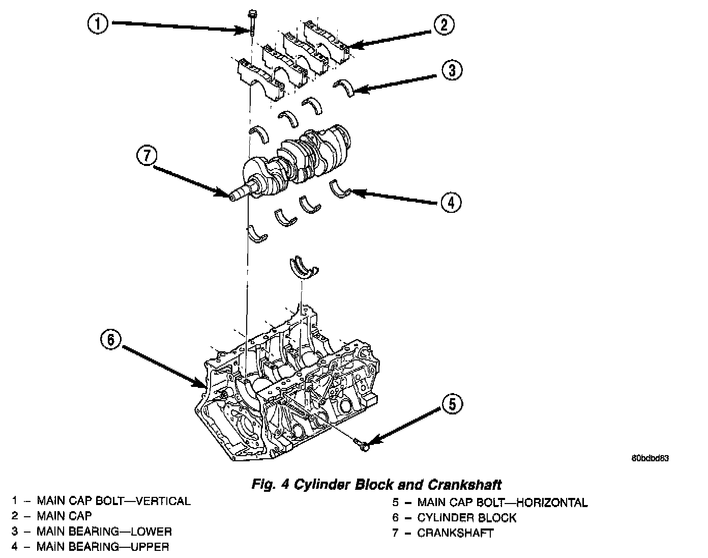 The crankshaft is constructed of a forged micro alloy steel. The six throw, nine counterweight crankshaft is supported by four select fit main bearings with the number three serving as the thrust washer location (Fig. 4). The select fit identification markings will be on the rear side of the number nine (rearmost) counterweight. The six separate connecting rod throws are an even-firing design which reduces torque fluctuations while a vibration damper is used to control torsional vibration.