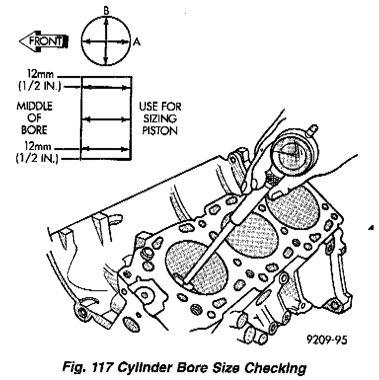 Measure the cylinder bore at three levels in directions A and B (Fig. 117). Top measurement should be 12 mm (0.60 inch) down and bottom measurement should be 12 mm (0.50 inch) up from bottom of bore. Refer to Cylinder Block Assembly, Specifications.