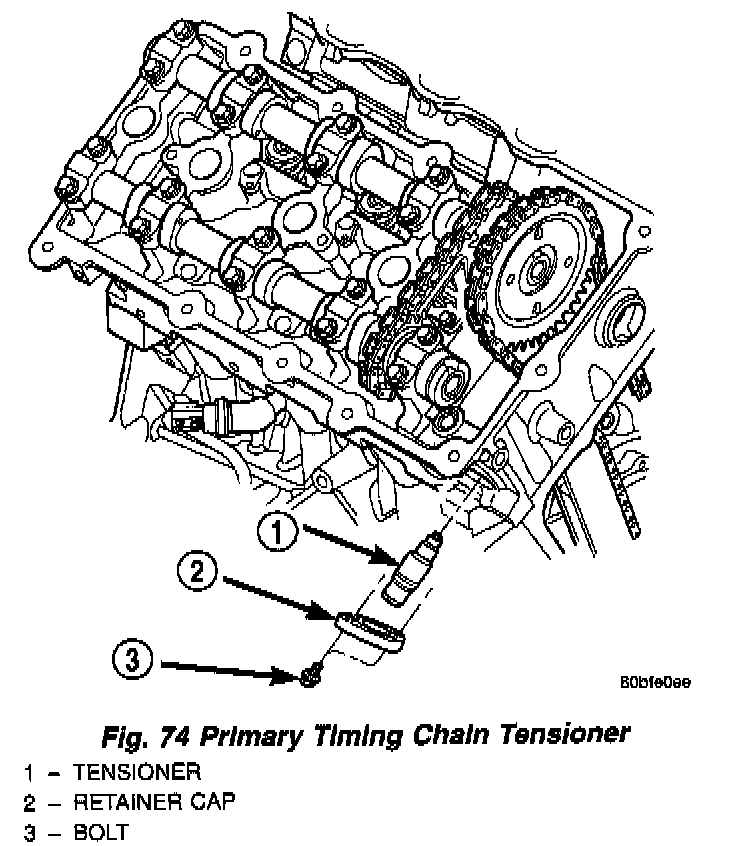 4. Remove primary timing chain tensioner from right cylinder head (Fig. 74).