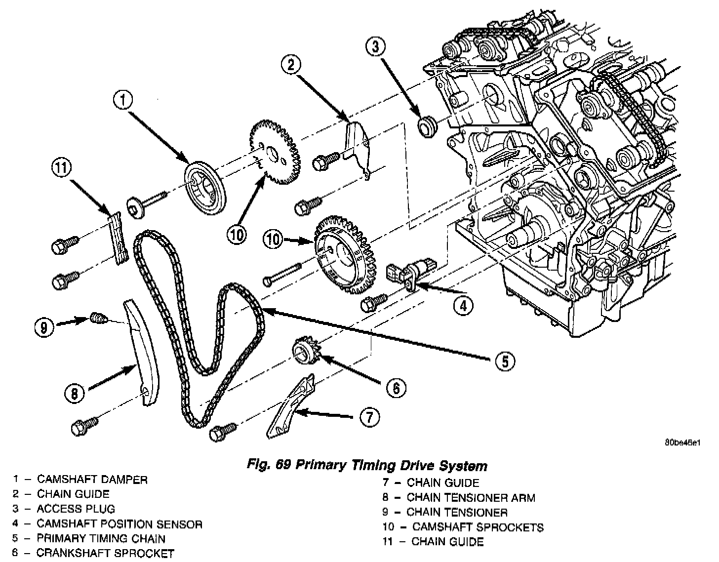 9. Remove lower chain guide and tensioner arm (Fig. 69).