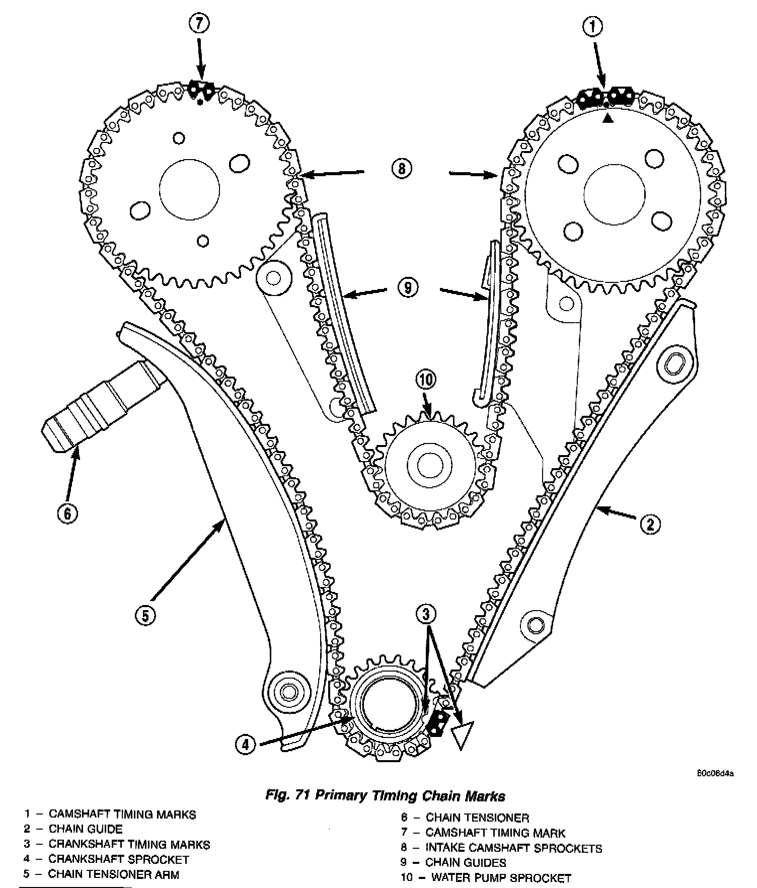 9. Align right camshaft sprocket timing mark to the timing (plated) link on the timing chain (Fig. 71) and loosely position over camshaft hub.