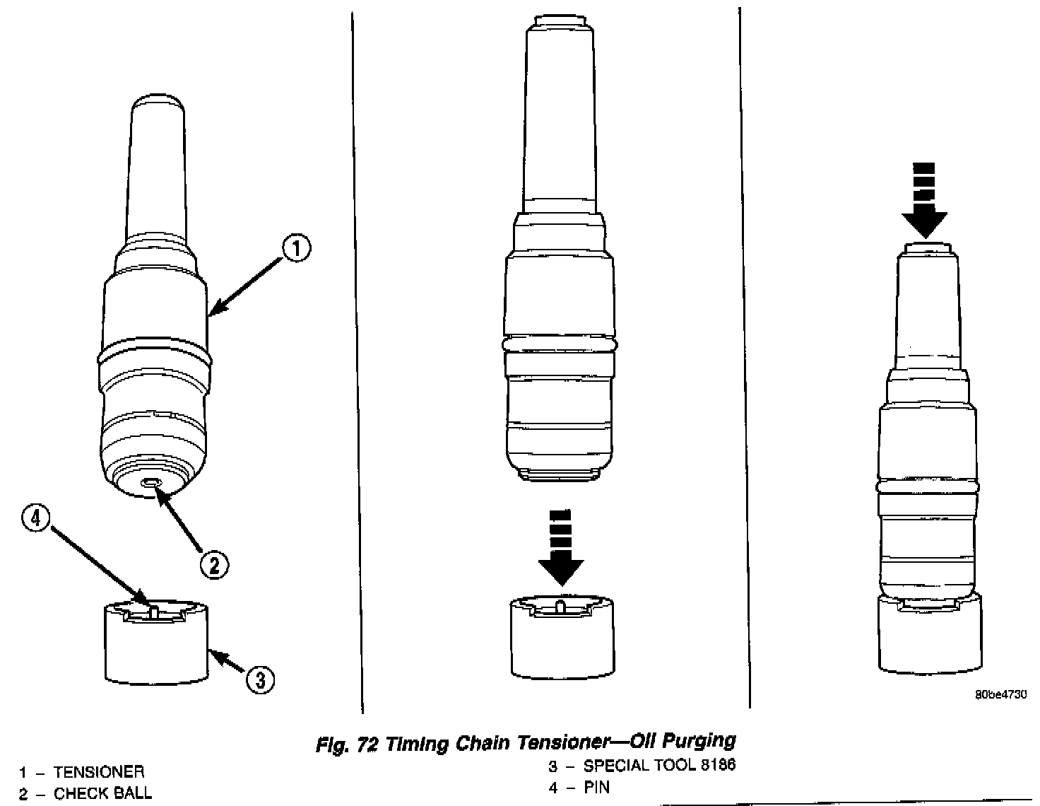 b. Using hand pressure, slowly depress tensioner until oil is purged from tensioner (Fig. 72).