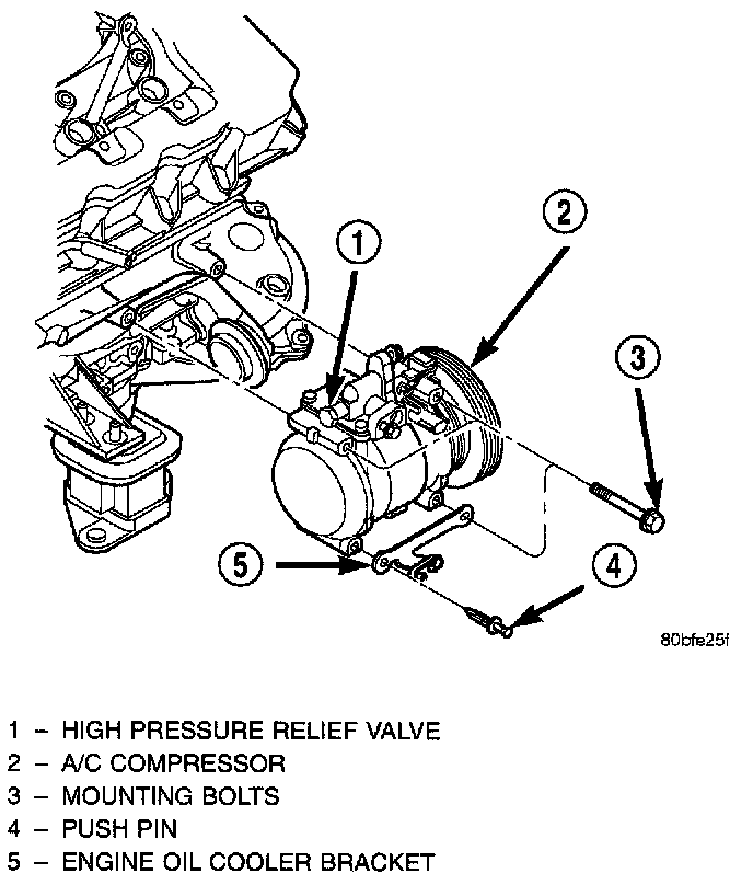 The A/C compressor may be unbolted and repositioned without discharging the refrigerant system. Discharging is not necessary if removing the compressor clutch/coil assembly, engine, cylinder head, or alternator.WARNING: REFRIGERANT PRESSURES REMAIN HIGH EVEN THOUGH THE ENGINE MAY BE TURNED OFF. DO NOT TWIST OR KINK THE REFRIGERANT LINES WHEN REMOVING A FULLY CHARGED COMPRESSOR. SAFETY GLASSES MUST BE WORN.