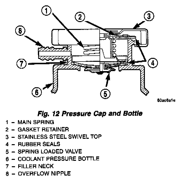 The cooling system cap is located on the coolant pressure bottle. The cap construction includes; stainless steel swivel top, rubber seals and retainer, main spring, and a spring loaded valve.
