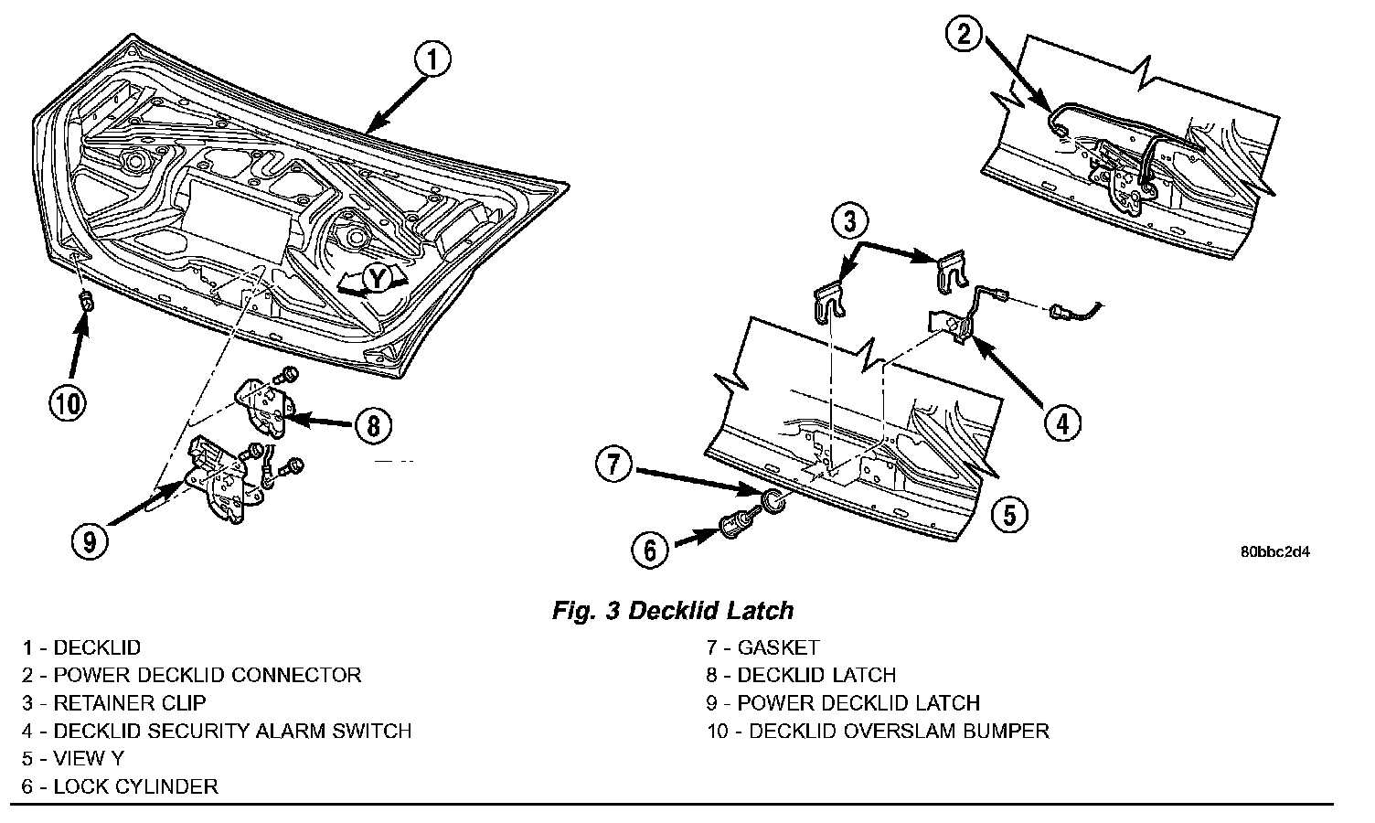 2. Remove bolts attaching decklid latch to decklid (Fig. 3).