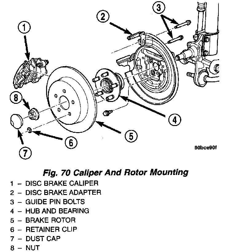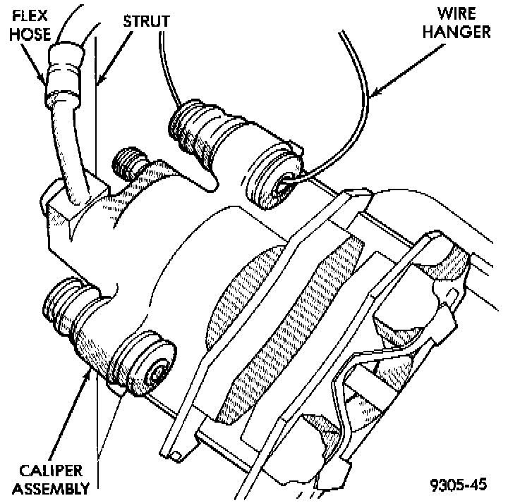 6. Hang the brake caliper from rear strut using wire or cord to prevent the weight of the caliper from damaging the brake hose.