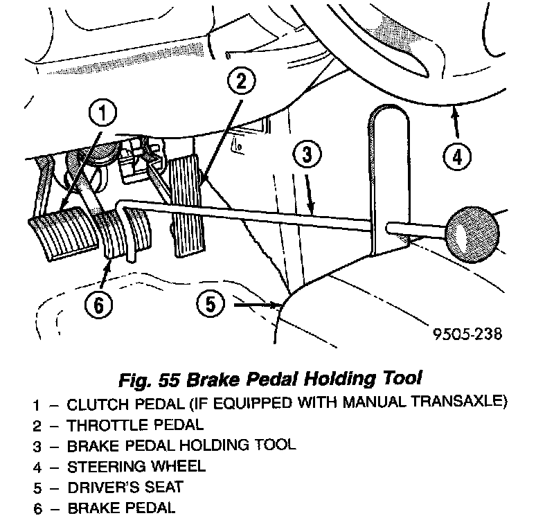 1. Using a brake pedal holding tool as shown, depress the brake pedal past its first one inch of travel and hold it in this position. This will isolate the master cylinder from the brake hydraulic system and will not allow the brake fluid to drain out of the master cylinder reservoir when the lines are opened.