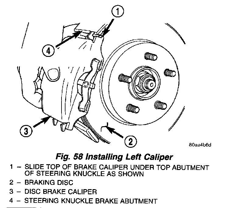 3. Install the disc brake caliper (with pads) on the brake rotor and steering knuckle. The left side caliper is installed by first sliding the top of the caliper past the top caliper slide abutment on the steering knuckle to hook the top edge of the caliper, then pushing the lower end of the caliper into place against the knuckle. The right side caliper is installed by first sliding the bottom edge of the caliper past the lower caliper slide abutment on the steering knuckle to hook the lower edge of the caliper, then pushing the top of the caliper into place against the steering knuckle.