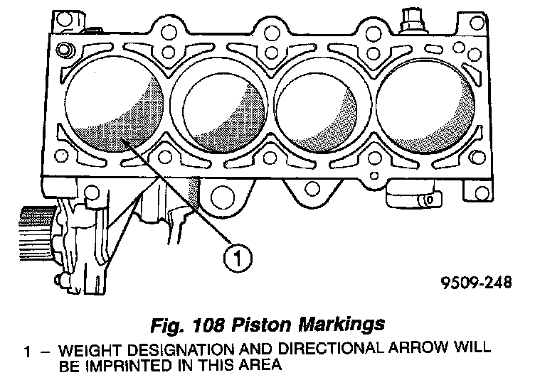 4. Pistons will have a stamping in the approximate location shown in (Fig. 108). These stamps will be either a directional arrow or a weight identification for the assembly. L is for light and H is for heavy. These assemblies should all be the same weight class. Service piston assemblies are marked with a S and can be used with either L or H production assemblies. The weight designation stamps should face toward the timing belt side of the engine.