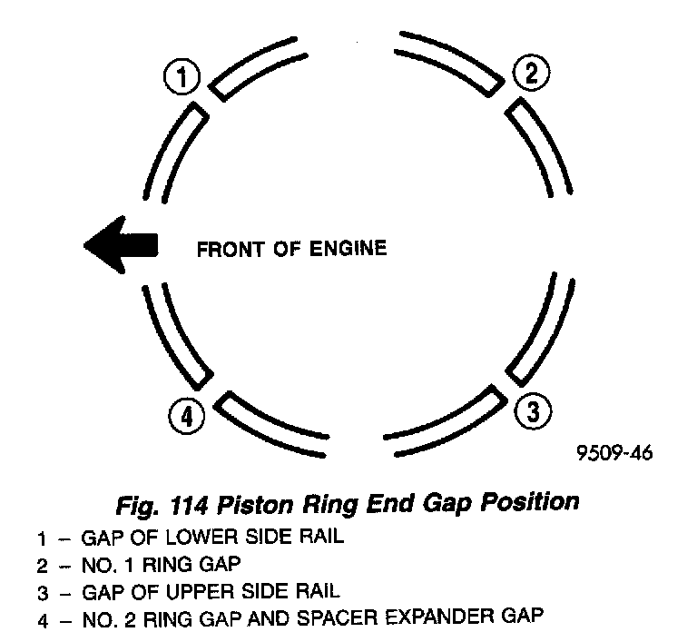 4. Position piston ring end gaps as shown in (Fig. 114).