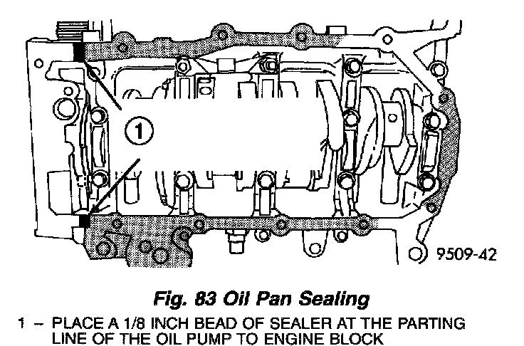 2. Apply Mopar Silicone Rubber Adhesive Sealant at the oil pump to engine block parting line (Fig. 83).