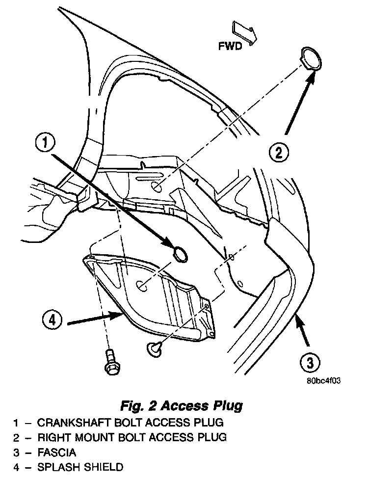 An access plug is located in the right splash shield (Fig. 2). Remove the plug and insert the proper size socket, extension and ratchet, when