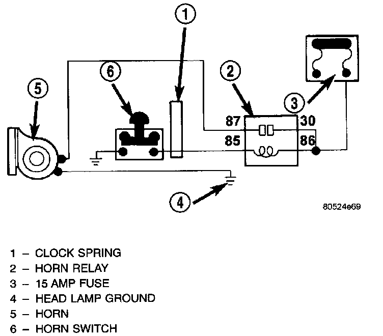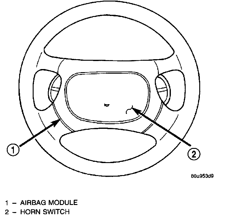 The horn switch is mounted between the outer and inner cover of the Driver Airbag Module. When the Driver Airbag is pressed the horn switch I makes contact to ground. The ground signal is carried to the horn relay and the horn sounds.