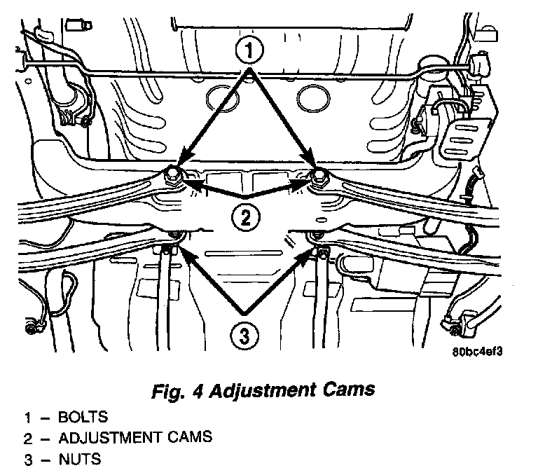 3. While holding the toe adjustment cams from turning, tighten the attaching bolt nuts. This will securely hold the adjustment cams in position. Tighten the attaching bolt nuts to a torque of 88 Nm (65 ft. lbs.).