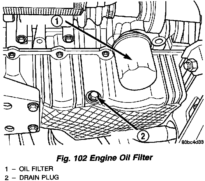 CAUTION: When servicing the oil filter (Fig. 102), avoid deforming the filter. Use an appropriate oil filter removing tool. Position filter wrench strap close the seam at the base of the filter. The oil filter seam that joins the can to the base, is reinforced by the base plate.
