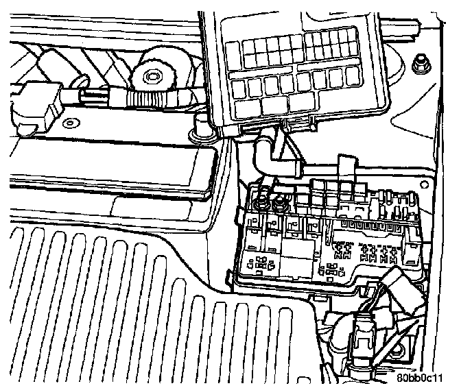 The PDC housing is secured to the left inner fender well an indexing pin and one screw. All of the PDC outputs are through the integral engine compartment wire harness.