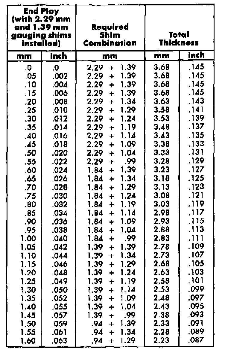 NOTE: If end play is too high, install a 0.05 mm (0.002 inch) thinner shim combination. If end play is too low, install a 0.05 mm (0.002 inch) thicker shim combination. Repeat until 0.05 to 0.25 mm (0.002 to 0.010 inch) end play is obtained.