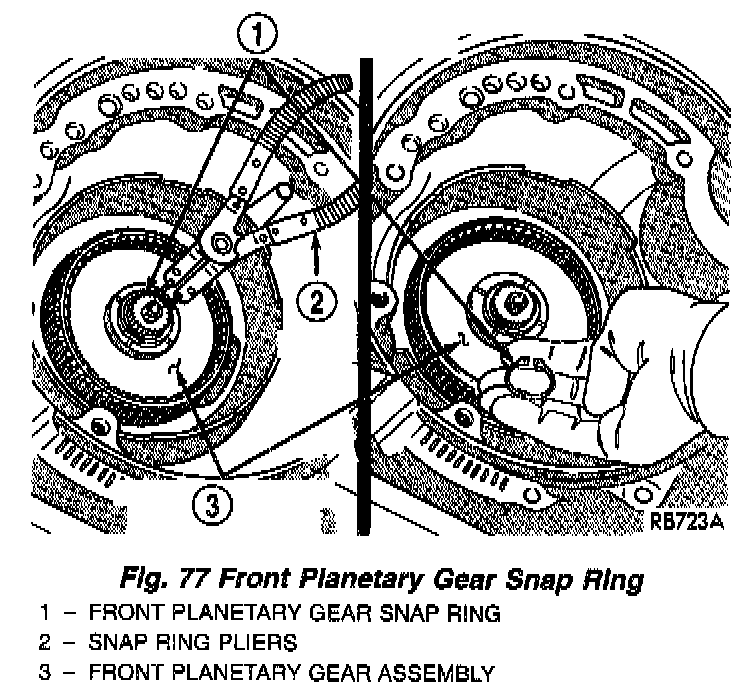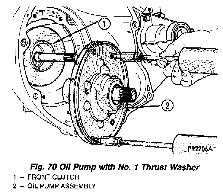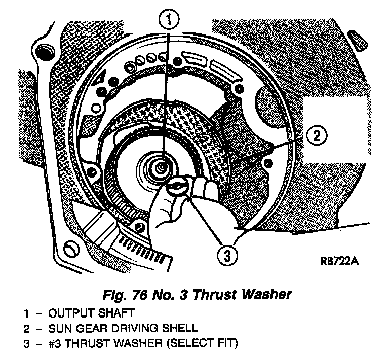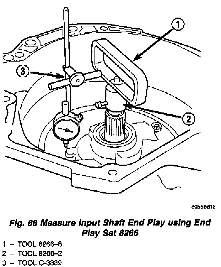 Measuring input shaft end play before disassembly will usually indicate if a thrust washer change is required (Fig. 66). The # 3 thrust washer is located between input and output shafts.