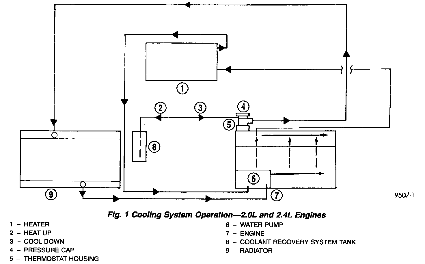The coolant flow circuits for 2.0L and 2.4L engine equipped vehicles are shown. The 2.5L engine coolant flow circuit is shown.