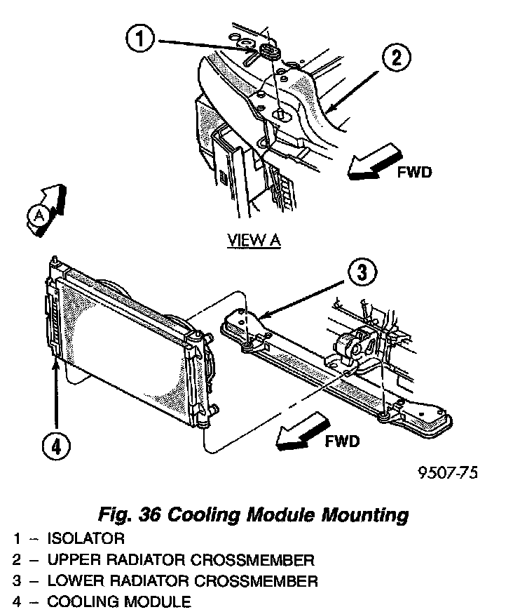 1. Slide radiator and fan module down into position, seat the radiator assembly lower rubber isolators in the mount holes provided.