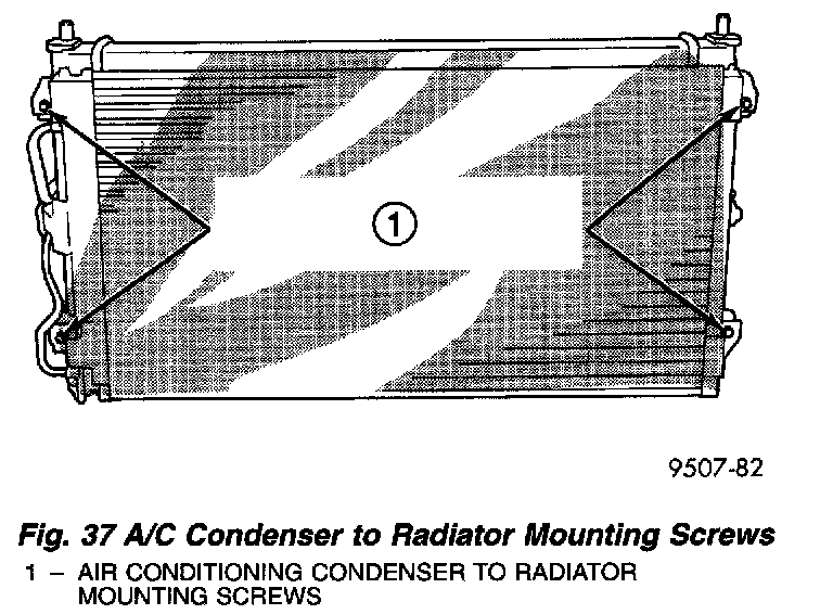 12. Remove the air conditioning condenser attaching screws located at the front of the radiator, if equipped. It is not necessary to discharge the air conditioning system to remove radiator.