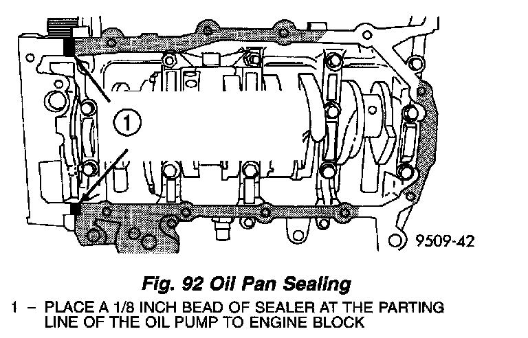 1. Apply Mopar Engine RTV GEN II or equivalent at the oil pump to engine block parting line (Fig. 92).