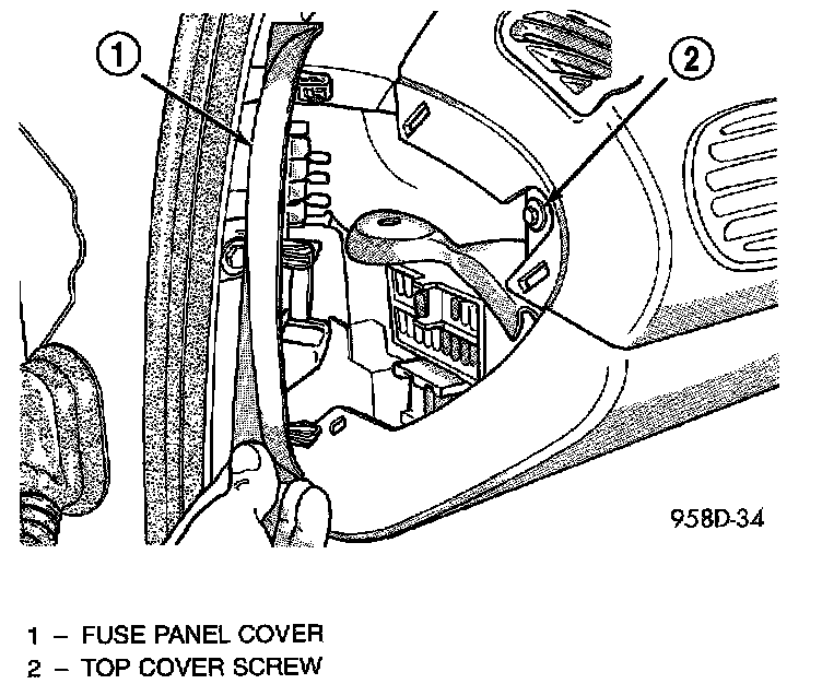 2. Remove fuse panel cover from left end of instrument panel. Remove screw holding end of instrument panel top cover.