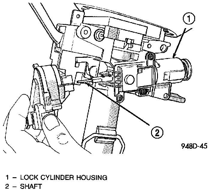 12. Place key cylinder in RUN position. Depress lock cylinder retaining tab and remove key cylinder.