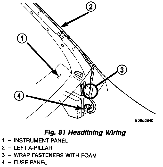 NOTE: It is not possible to reinstall the push in fasteners holding the wiring harness to the instrument panel bracket and to the fuse panel area. Wrap these two fasteners with foam tape to prevent buzz, squeak, and rattle complaints (Fig. 81).