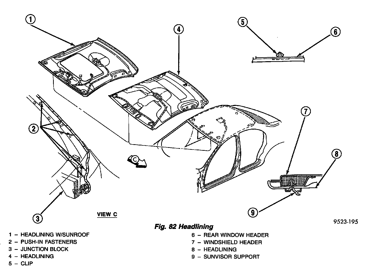 13. Using Special Tool C-6967, disengage headline rear locating clip holding headlining to roof above rear window (Fig. 82).