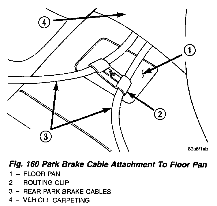 13. Remove the routing clip attaching the rear park brake cables to the floor pan of the vehicle.