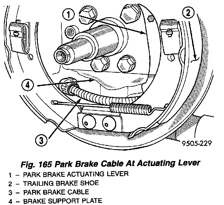 4. Install the park brake cable on the park brake actuating lever of the trailing brake shoe .