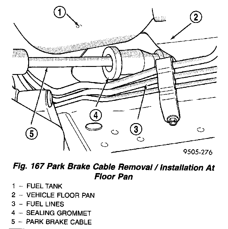25. Remove the park brake cable and sealing grommet from the floor pan of the vehicle.