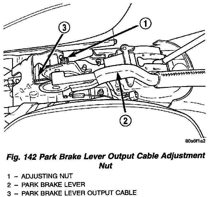 8. Loosen adjusting nut on park brake cable output cable. This will take tension off park brake cables, allowing rear park brake cables to be easily removed from tension equalizer.